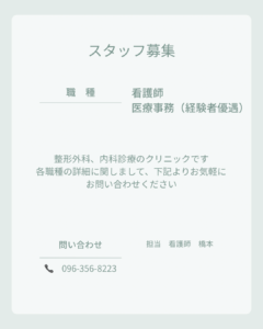 看護師、医療事務(経験者優遇)の募集を行っております。